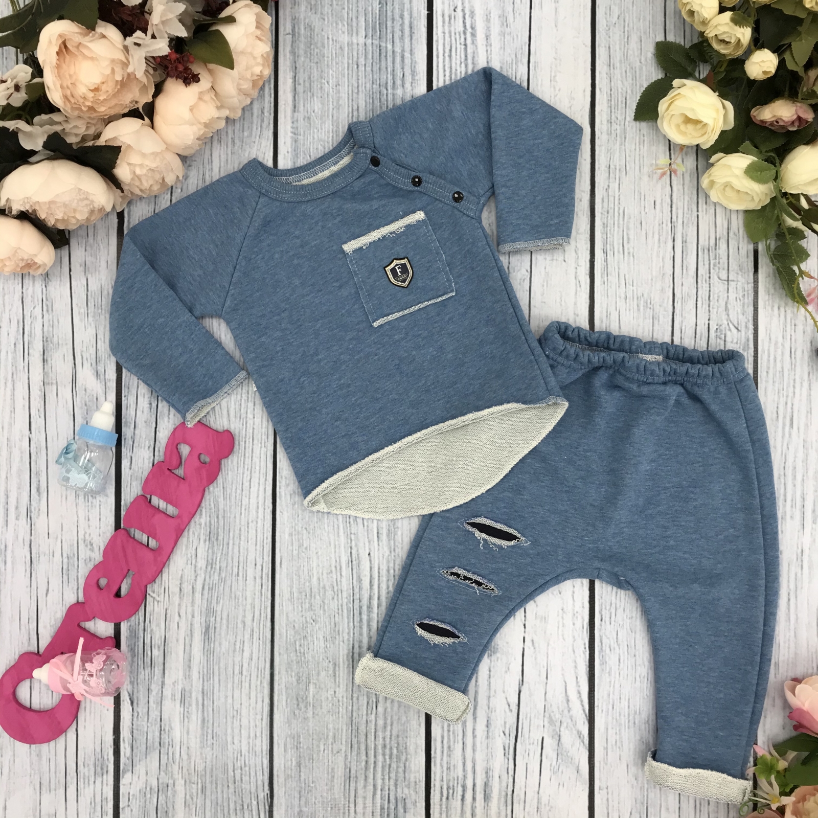 Купить оптом 239. Костюм ясельный, хлопок 65%, 35% ПЭ, 3-х нитка футер без начеса, джинса 74,80,86 в Магнитогорске