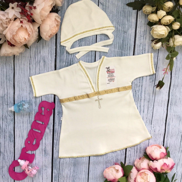 Купить оптом 170. Крестильная рубашка с чепчиком (золото), хлопок 100 % интерлок 62,68,74,80 в Магнитогорске